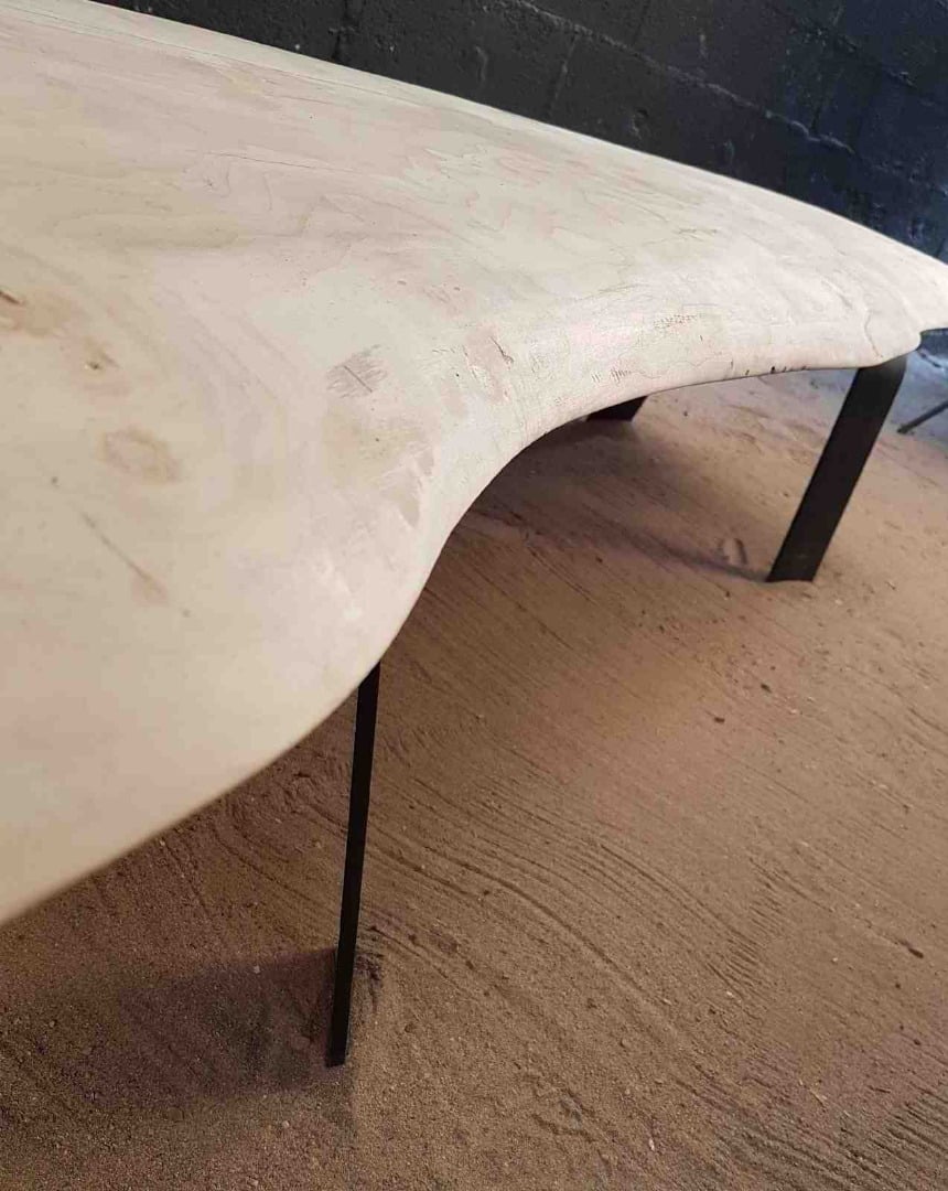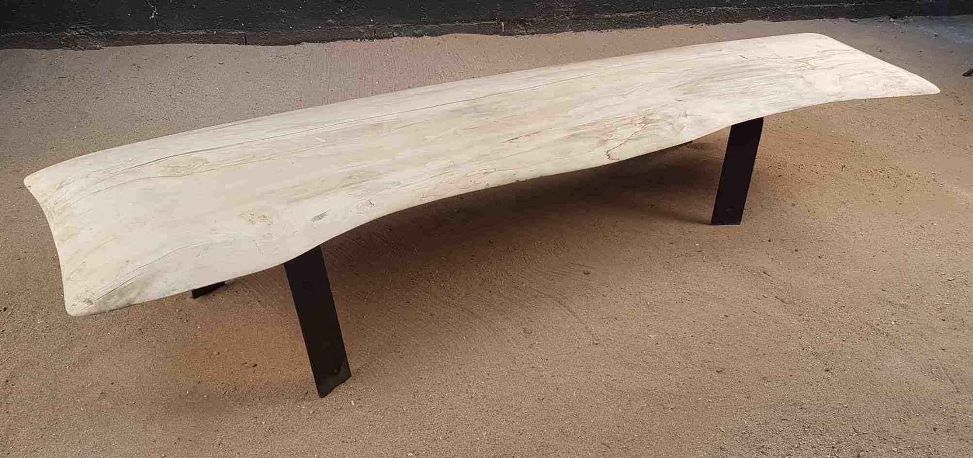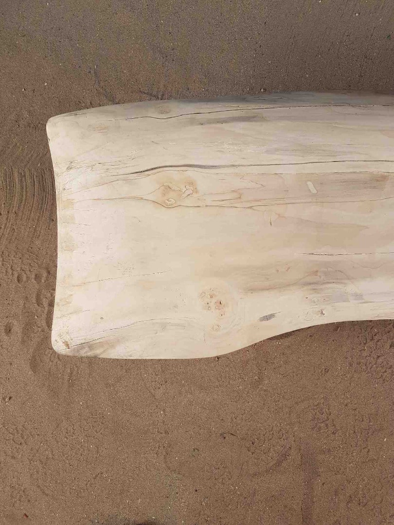 Une planche en bois flotté de 1m60 de longueur environ par 40cm environ de largeur, repose sur des pieds en bois flotté ou en acier selon votre envie.