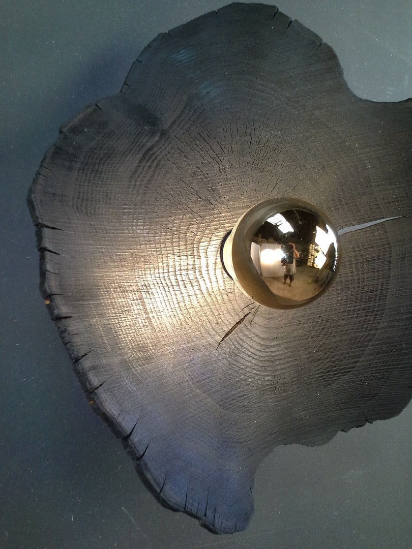 Cette applique est réalisée avec une rondelle en bois debout et brulée selon la technique Japonaise « shou-sugi-ban ».