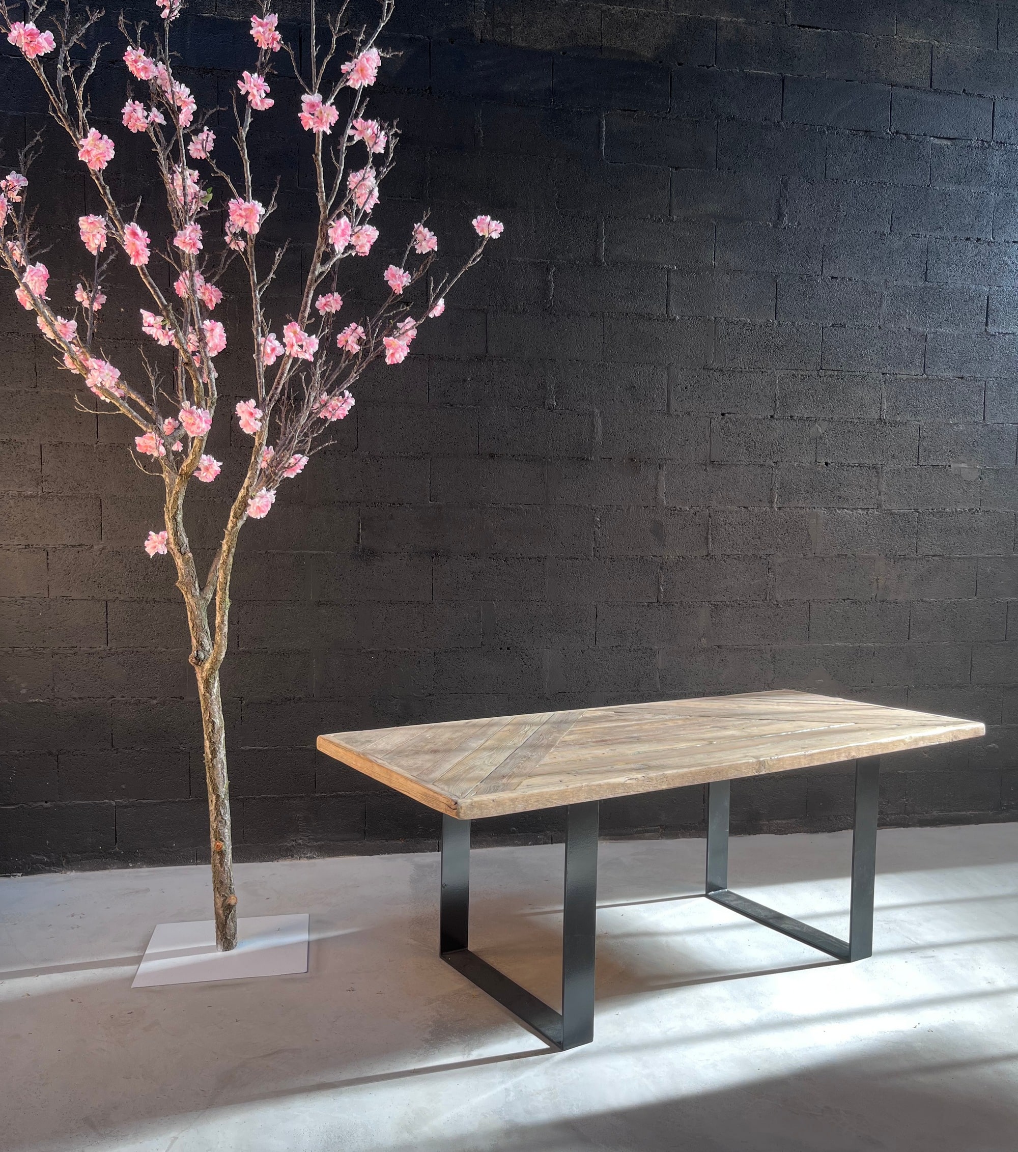 Cette table est construite à partir de véritables planches de bois flotté , vieillies et polies par les flots et assemblées façon marqueterie.