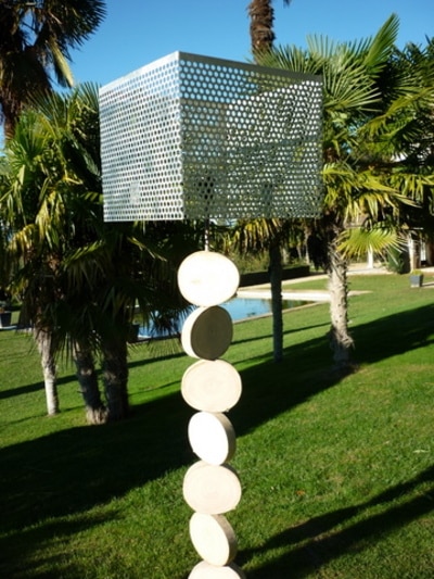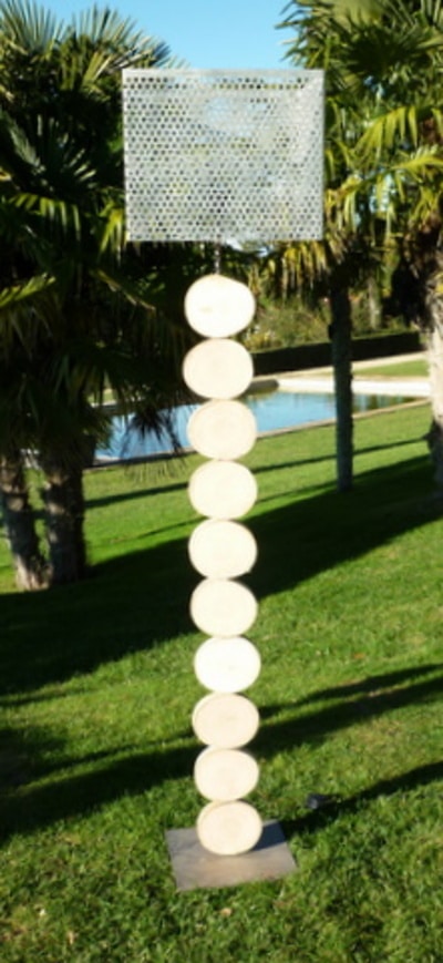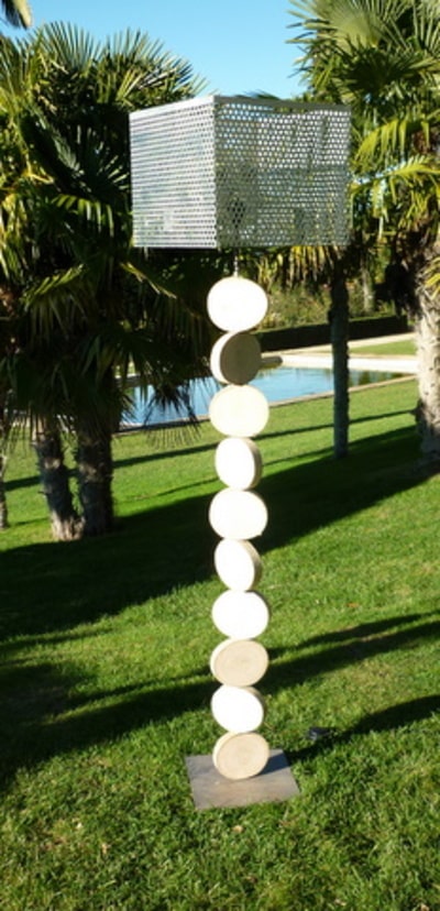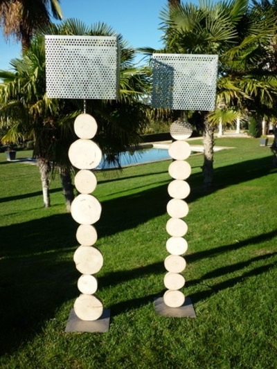 Ce lampadaire est construit avec des tranches de troncs de bois flotté. Il mesure 1m80 de hauteur avec l’abat jour. Cet abat jour peut être remplacé par un autre en tissus écru ou gris, il mesure 40cm par 40cm.