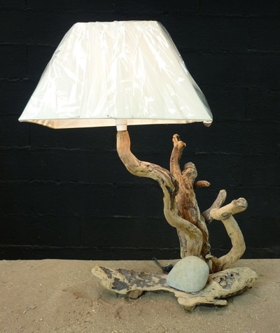 Lampadaire tronc bois flotté abat jour plumes