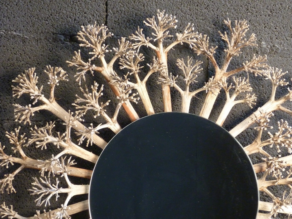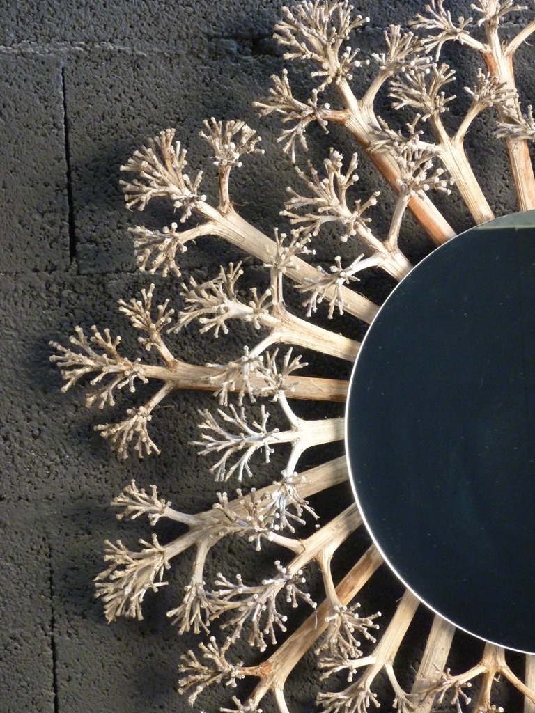 Ce miroir est réalisé avec des fleurs d’agaves séchées. Il mesure environ 1m de diamètre, c’est une pièce unique. Il peut être réalisé sur mesure.