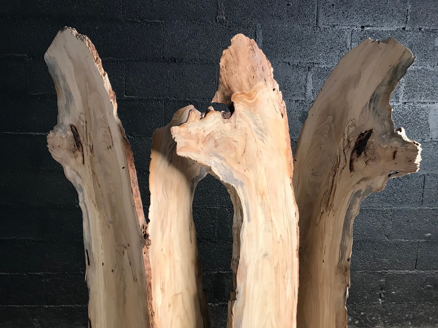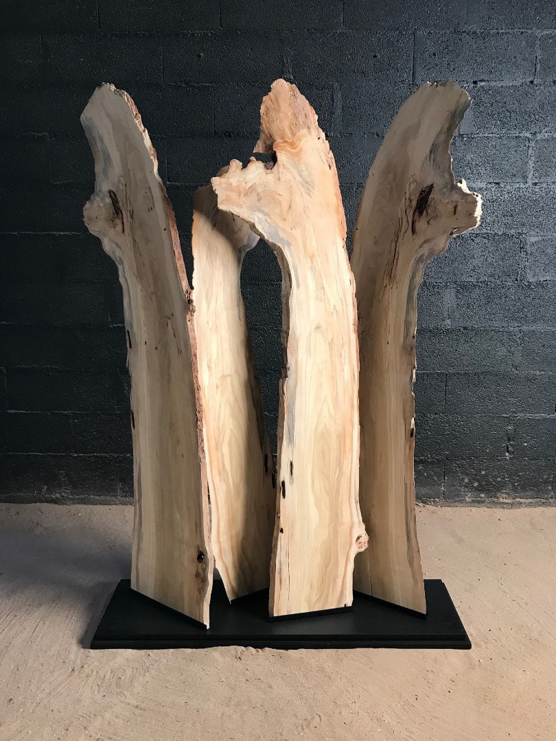 Il y a 4 planches provenant d’un même tronc et fixées sur un socle en bois peint en noir.