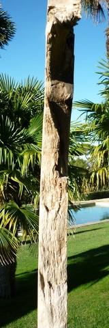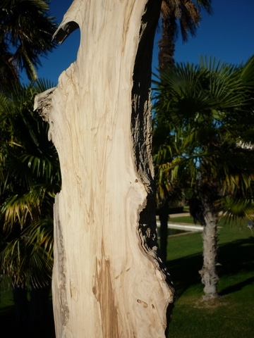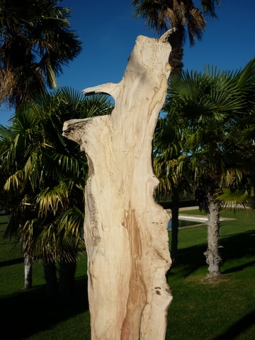 Une planche est découpé dans un tronc en bois flotté puis elle est fixée sur un socle en bois peint en noir.