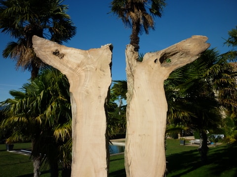 2 planches en bois flotté de 2m environ de hauteur et 25cm de largeur avec une forme originale sont montées sur un socle afin de faire l’effet papillon.