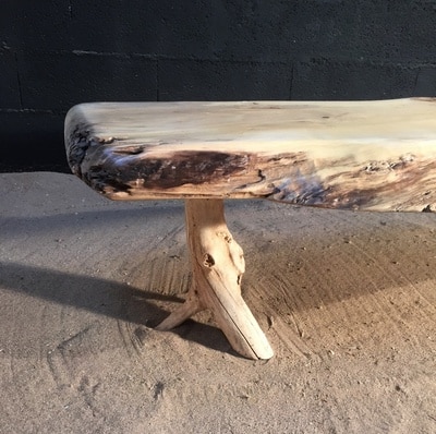 Cette table basse est réalisée avec une planche en bois flotté de 6cm d’épaisseur sur 1m60 environ par 40/50cm de largeur.