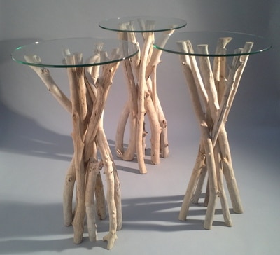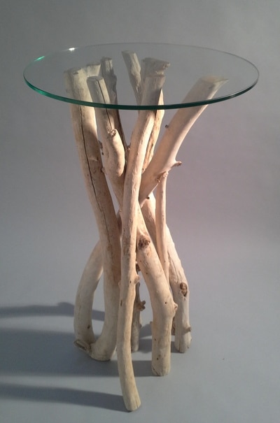 Ce mange debout mesure 110cm de hauteur, et 65cm de diamètre. Un plateau en verre trempé est posé sur les branches en bois flotté.