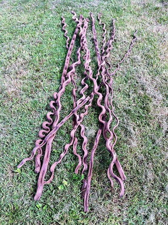 Liane ondulée naturelle de longueur 1m60 à 2m. Diamètre 3/4 cm. Prix à l’unité.